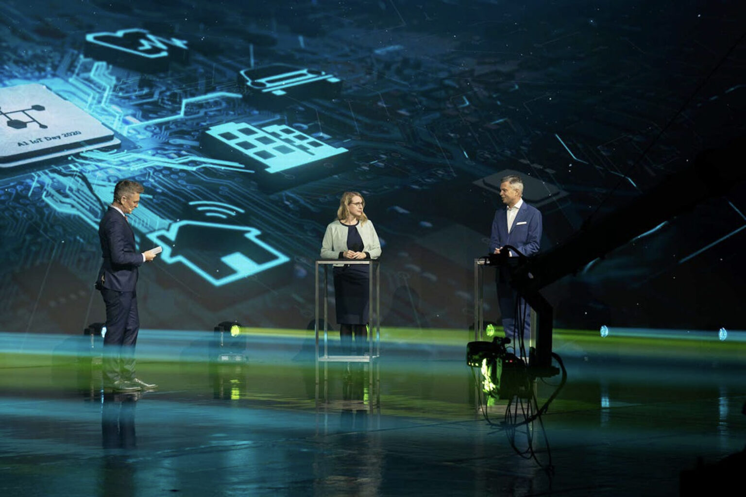 Höhepunkt des ersten virtuellen A1 IoT Day war die IoT Show mit Frau Bundesministerin Margarete Schramböck, A1 Group CEO Thomas Arnoldner und Mercedes-Motorsportchef Toto Wolff die aus dem Virtual Production Studio Vienna übertragen wurde. Auf einer 270° LED Wand wurden zugeschaltete Gesprächspartner, Informationen und Grafiken beeindruckend dargestellt, ähnlich wie bei einer TV-Show. Moderiert wurde die A1 IoT Show von Andi Knoll.